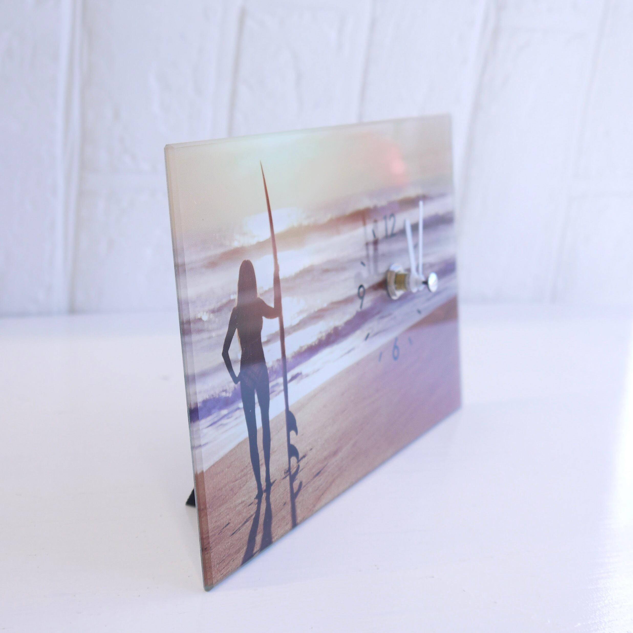 ★ハワイアン雑貨★ハワイ 時計/ガラスアートピクチャー/デスククロック/ビーチ/サーファーガール<サンセット>