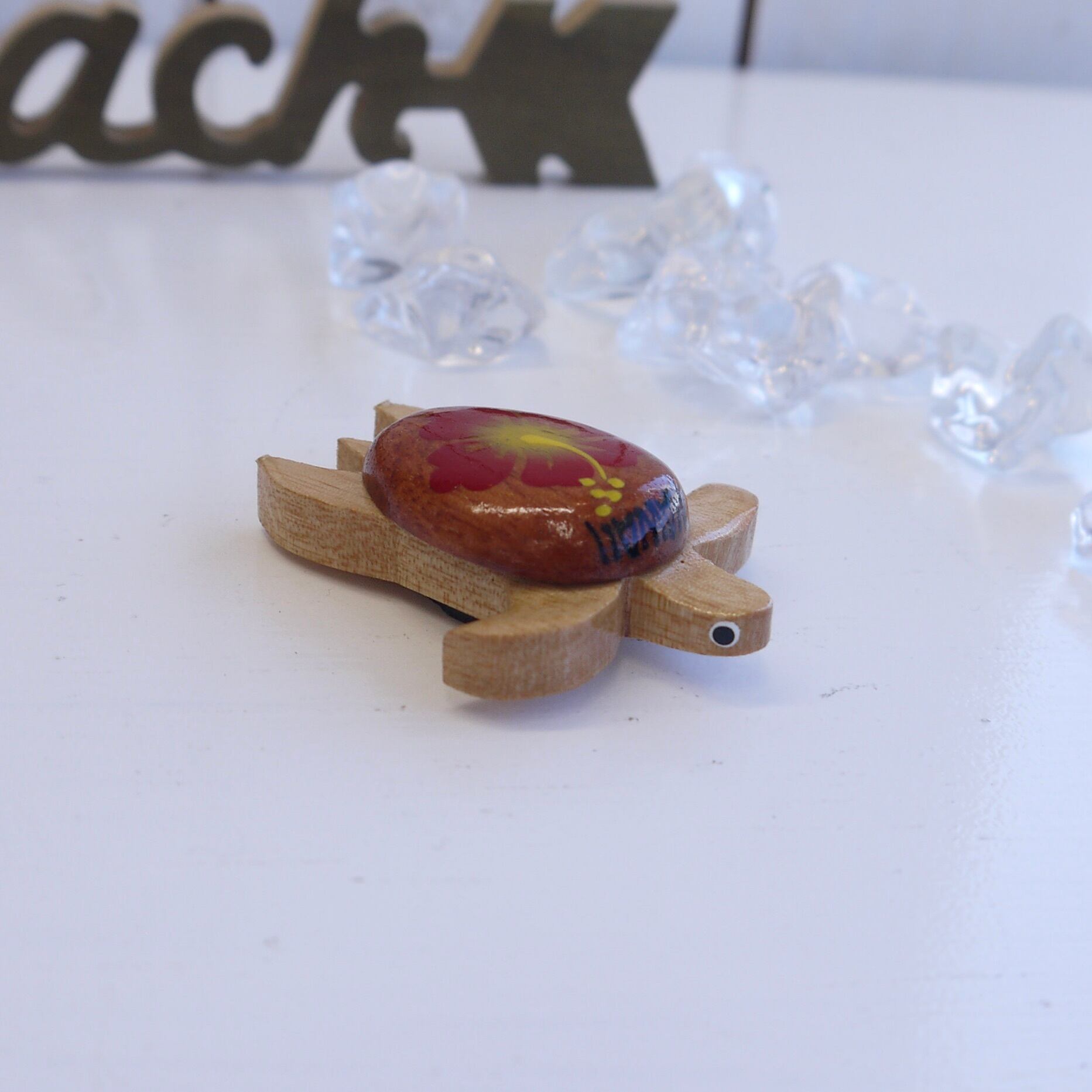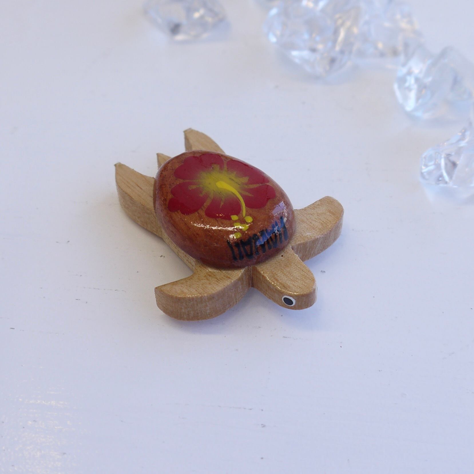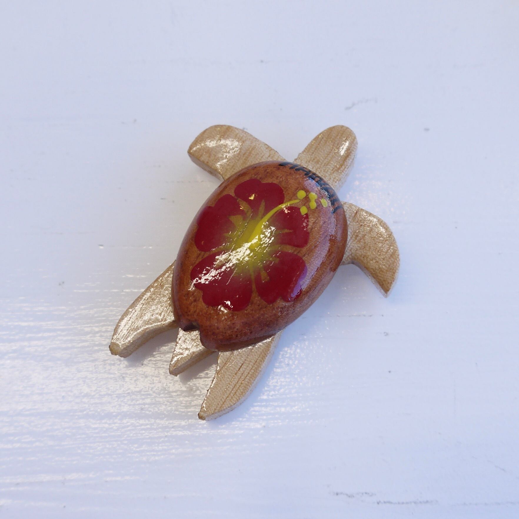 甲羅にハイビスカスのペイントがありお目目もあってかわいいマグネットです♡