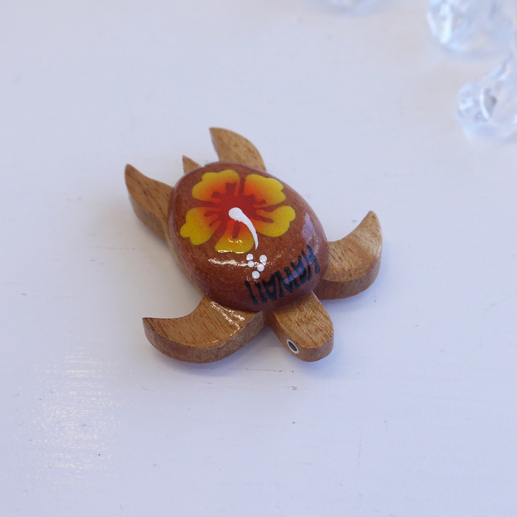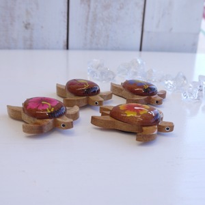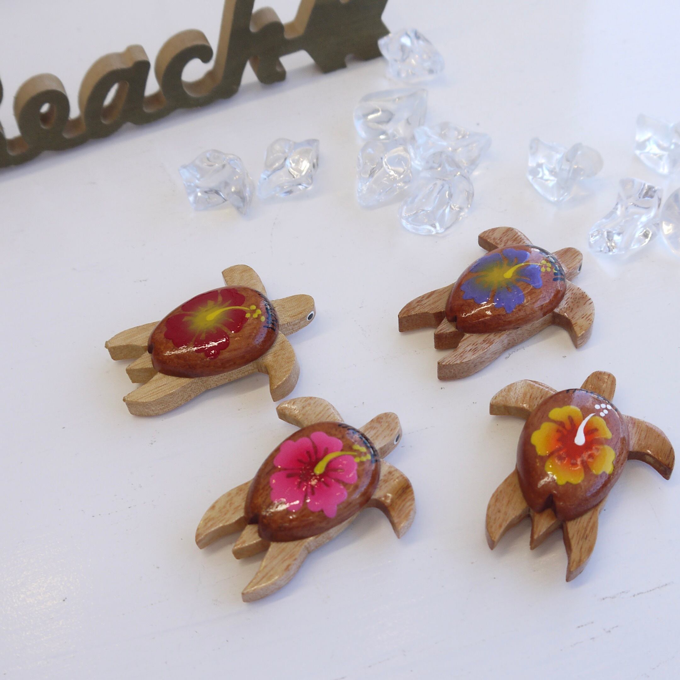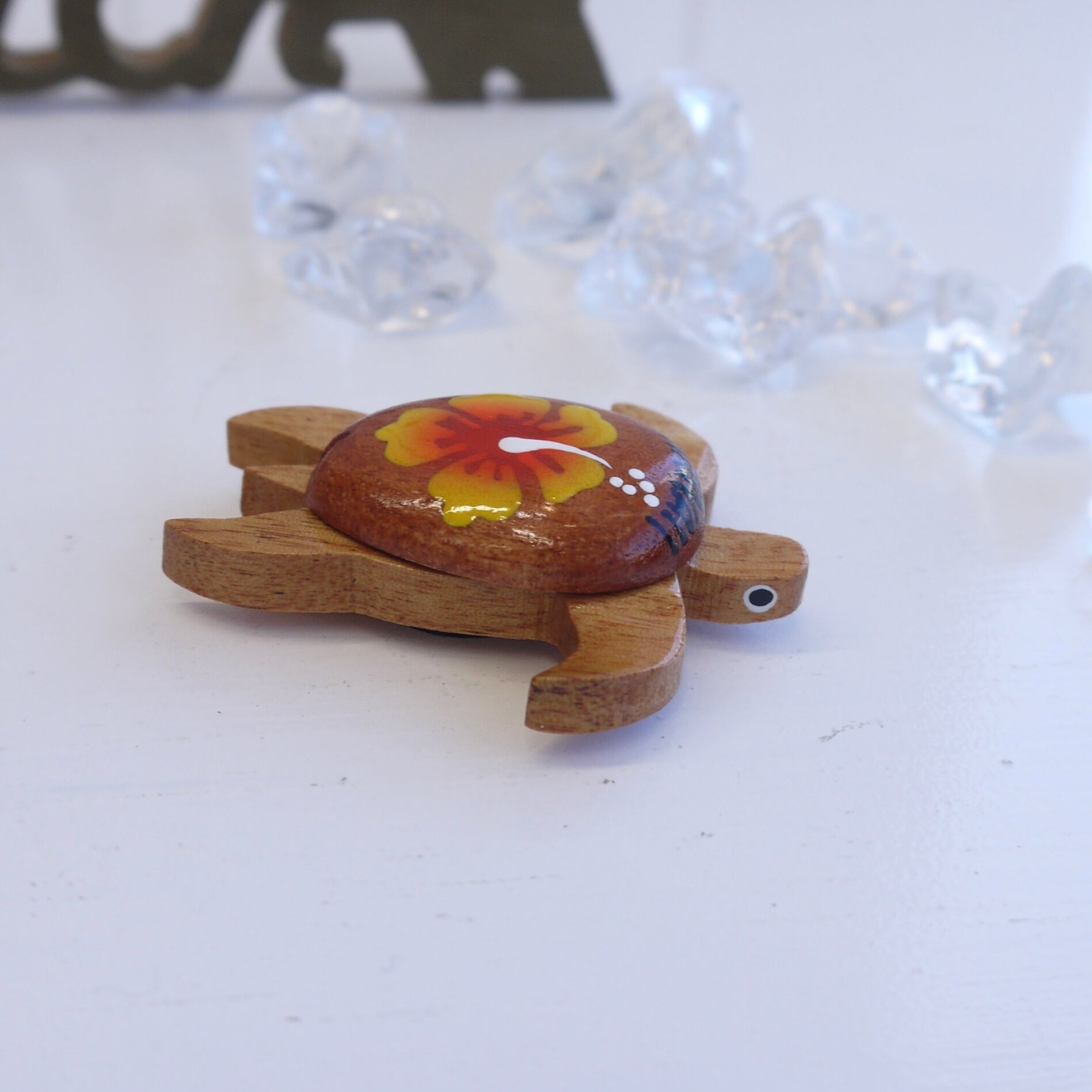 甲羅にハイビスカスのペイントがありお目目もあってかわいいマグネットです♡