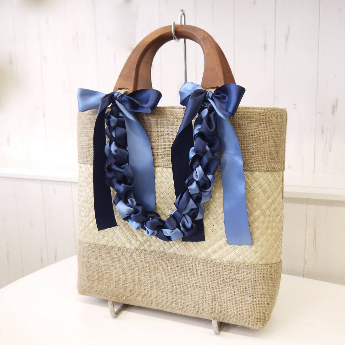 ハワイ カゴバッグ リボンレイ付き ラウハラトートバッグ ハンドメイド 母の日 プレゼント 1点もの 工芸品 ブルーリボン ハワイ直輸入