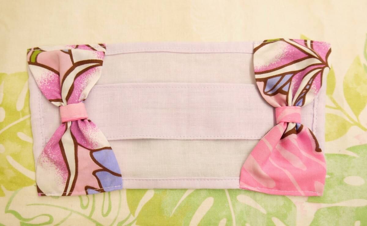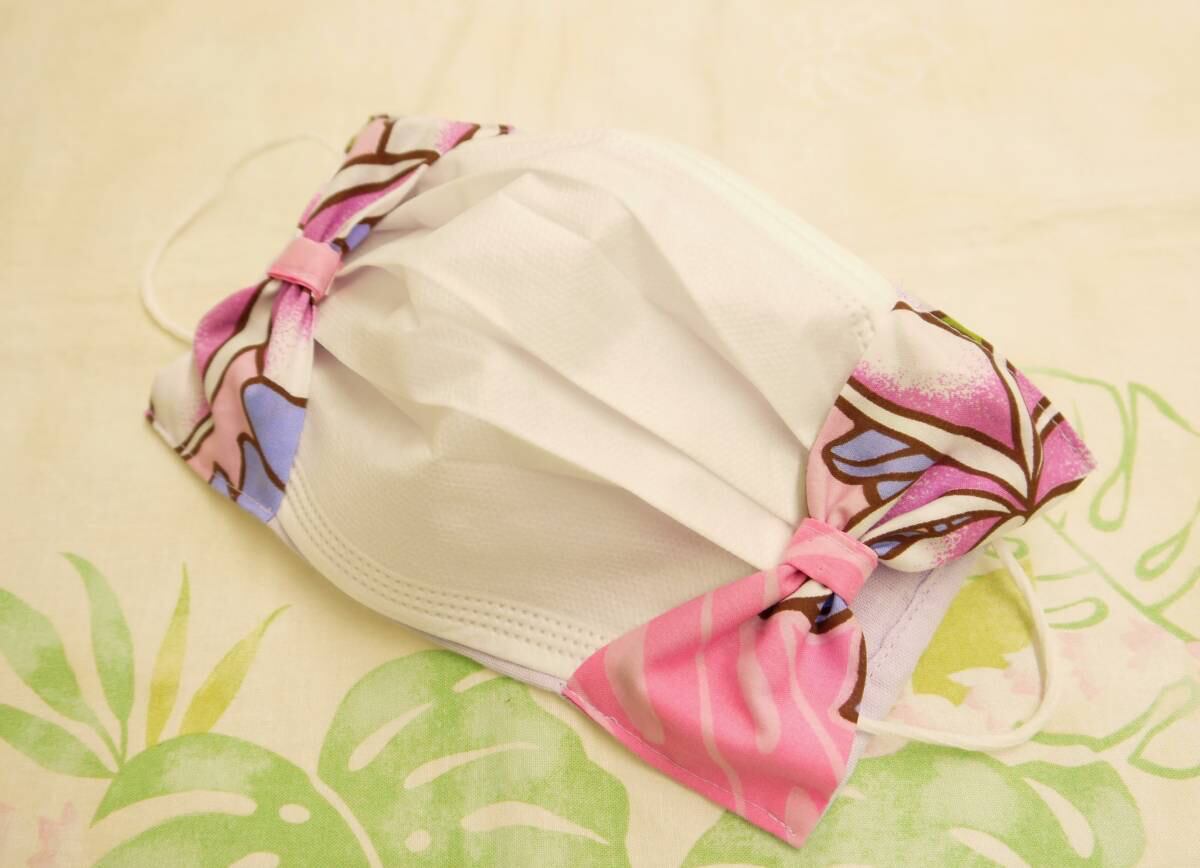不織布マスクによる肌荒れ、汗でムレたりする不快感がなくなるように吸収の良いWガーゼを使用し、サイドには可愛いハワイアンファブリックでリボンをつけました♪
