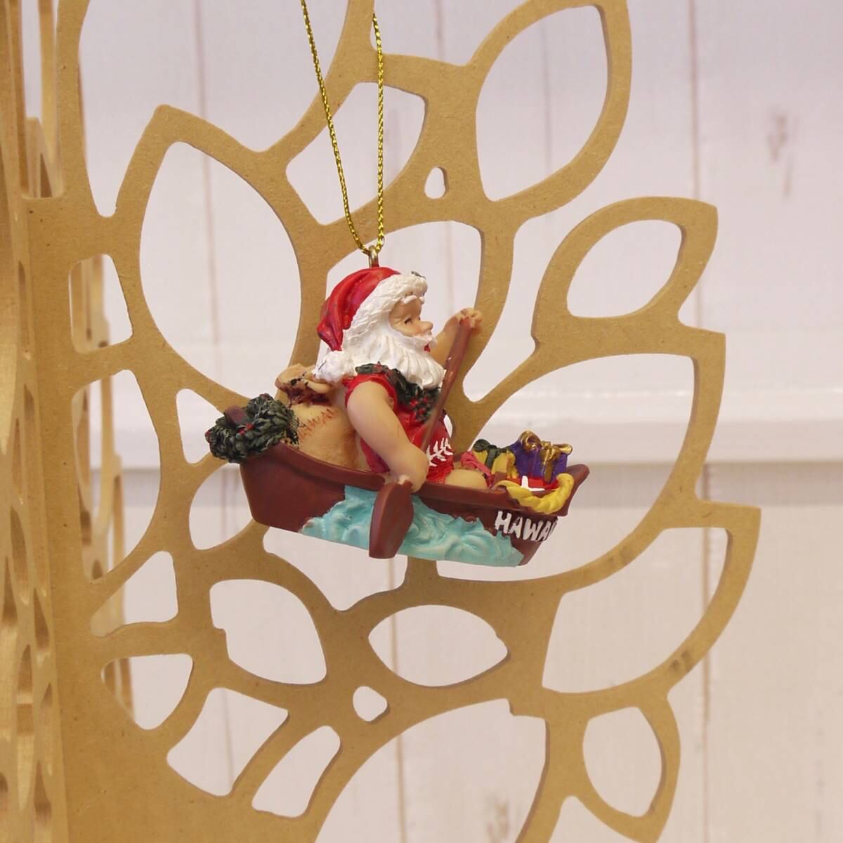 プレゼントを乗せてカヌーを漕ぐサンタさんのハワイアン クリスマス オーナメントです♡